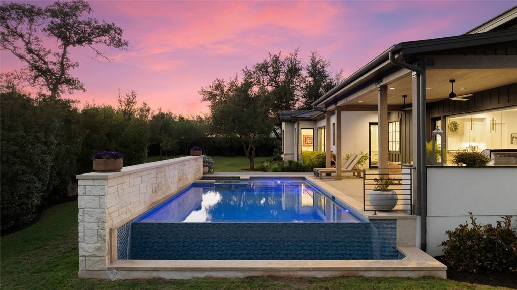 Welcome to 17213 Morning Grove Lane, a beautifully executed single-story custom home built by Eppright Homes in 2023 and situated on a flat, oak-studded lot in the gated community, Madrone Canyon. With thoughtful architecture and timeless Hill Country appeal, this home pairs soft modern finishes with warm natural textures highlighted by wide-plank wood floors, vaulted ceilings with beams, designer lighting, and abundant natural light throughout. An open-concept layout connects the spacious living room, dining area, and gourmet kitchen, where professional-grade appliances and a generous island anchor the heart of the home. Designed for both comfort and flexibility, the home includes four spacious bedrooms each with its own en-suite bath, plus two separate offices, a dedicated pool bath, and a well-appointed four-car garage. The primary suite is a private retreat, featuring serene backyard views, a spa-style bath with a deep soaking tub, oversized walk-in shower, dual vanities, and a beautifully customized closet. Every detail inside has been intentionally selected, from the ambient lighting and wallpaper accents to the automated window shades and bespoke hardware. Out back, a resort-style pool and spa with a negative edge and waterfall feature become the centerpiece of the landscape, surrounded by a large covered patio, raised garden beds, and open lawn shaded by mature oaks. With its calm, elegant style and a layout that blends functionality with ease, 17213 Morning Grove Lane offers refined Hill Country living just minutes from everyday conveniences in both Bee Cave and Lakeway along with top-rated Lake Travis schools.