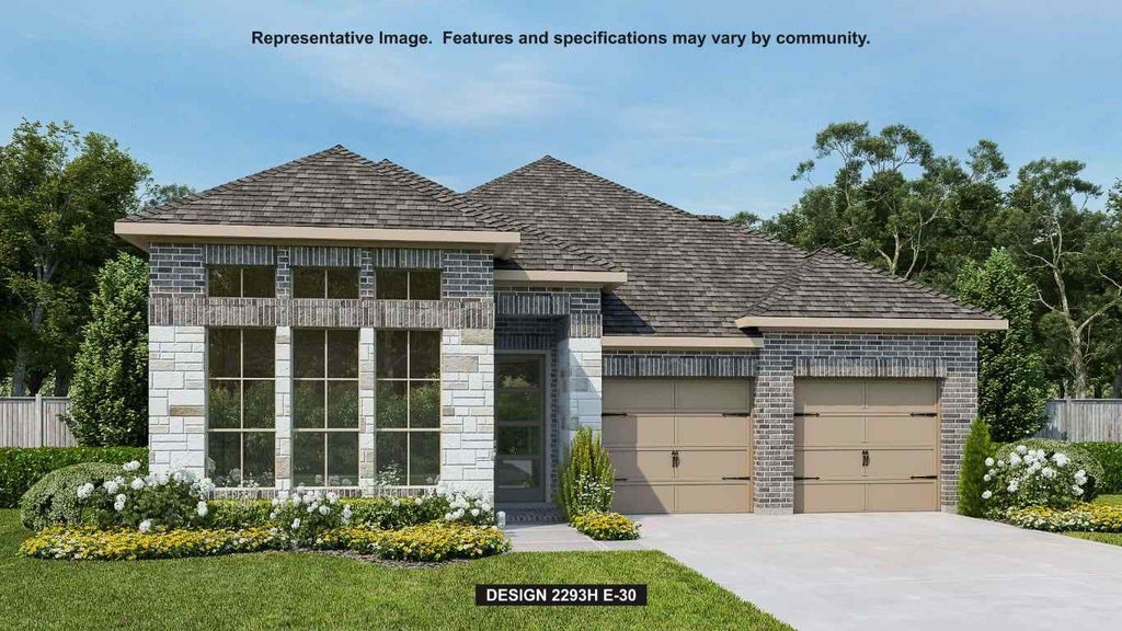 Home office with French doors off extended entry with 12-foot ceiling. Spacious family room with wall of windows opens to kitchen and dining area. Kitchen offers walk-in pantry, a 5-burner gas cooktop and generous island with built-in seating space. Private primary suite includes bedroom with wall of windows. Double doors lead to primary bath with dual vanities, corner garden tub, separate glass-enclosed shower and large walk-in closet. This open one-story design features a guest suite with full bath. Abundant closet space throughout. Extended covered backyard patio. Mud room off three-car garage.